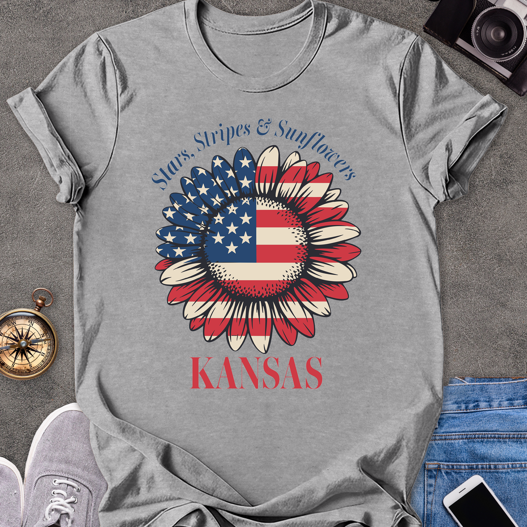 Star, Stripes & Sunflowers - Kansas | Unisex Softstyle T-Shirt | Kansas Travel Tee